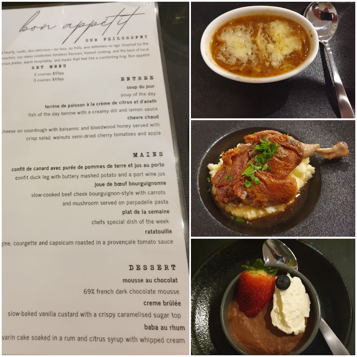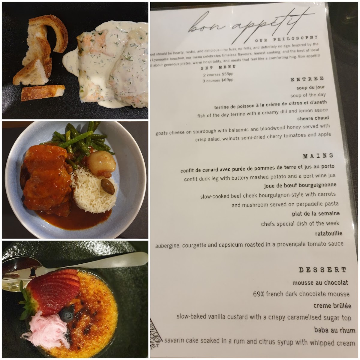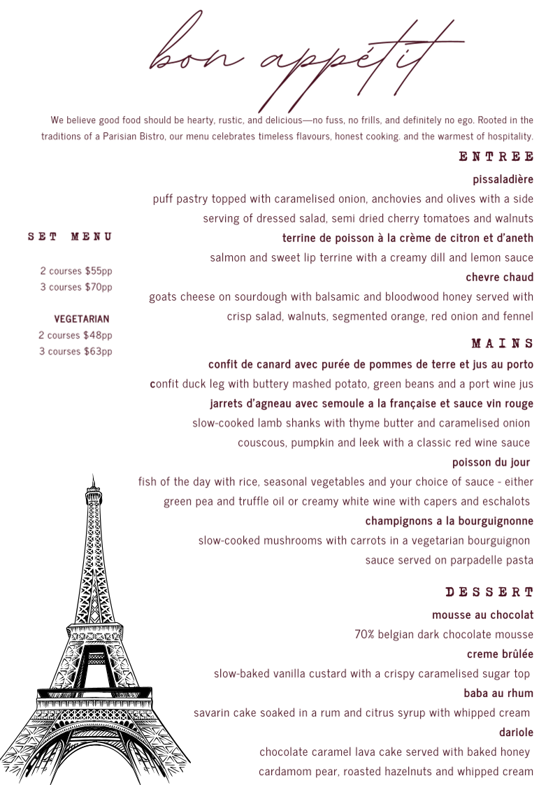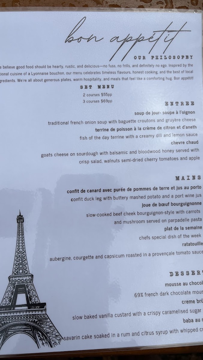 The menu features a variety of elegant starters like goat cheese on toasted sourdough and fish terrine with creamy dill and lemon. Main courses include traditional French classics such as confit duck leg with buttery mashed potato and slow-cooked lamb shanks, bringing a sense of heartfelt home cooking. For dessert, you might indulge in rich chocolate mousse or the delicate crisp-top vanilla crème brûlée, each offering a subtle sweetness to complete the meal.